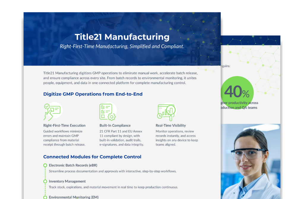 Schedule a demo of Title21 Manufacturing and see how teams replace paper, reduce deviations, and gain real-time visibility from batch start to release.